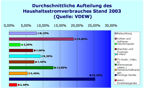 zeigt, tragen alle Bedarfsbereiche des Haushalts erheblich zum Gesamtstrombedarf bei. Es lohnt sich , nach potentiellen Einsparmöglichkeiten zu suchen. Wichtige Verbrauchs-Schwerpunkte sind vor allem Kühl- und Gefriergeräte, Unterhaltungselektronik, Geräte zur Warmwasserbereitung und die Beleuchtung